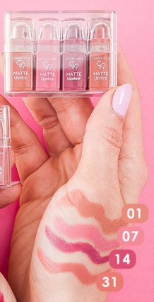 W skład zestawu wchodzą następujące miniatury pomadek Velvet Matte: 01, 07, 14, 31.